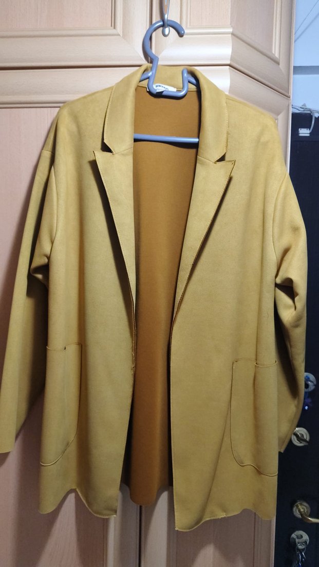 Sarı süet kadından kaban, kesik yakalı ve regular fit. Midi boy, uzun kollu, ofis için uygun, desen içermeyen pastel tonlarda, minimal ve şık görünümlü.