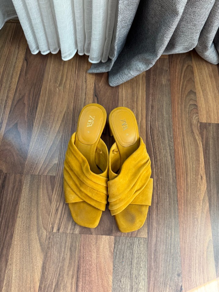 Sarı gerçek süet malzemeden, blok topuklu ve pliseli tasarıma sahip kadın terlik. Minimalist ve bohem tarzıyla günlük kullanıma uygundur. 1 kez kullanıldı