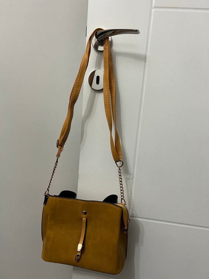 Tokalı askıya sahip sarı süet kadın çantası, parlak yüzey ve leopar desenli. Trendy casual ve sokak tarzına uygun.