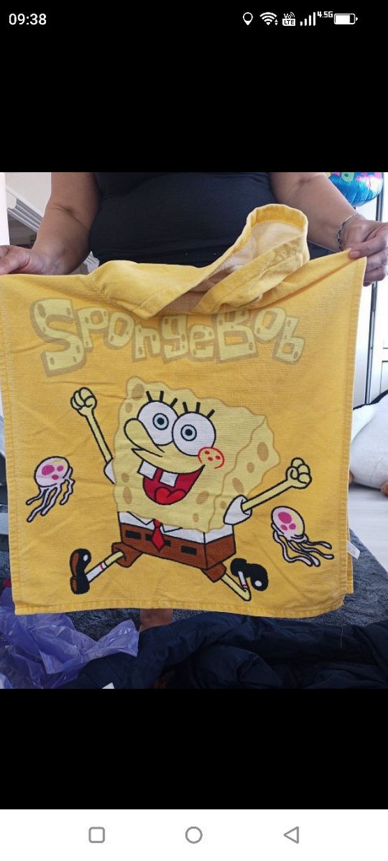 Canlı renklerde, Sünger Bob baskılı sarı havlu, sokak tarzı desenle süslenmiştir. 1 sezon kullanıldı 2-3 yaşa tam uygun