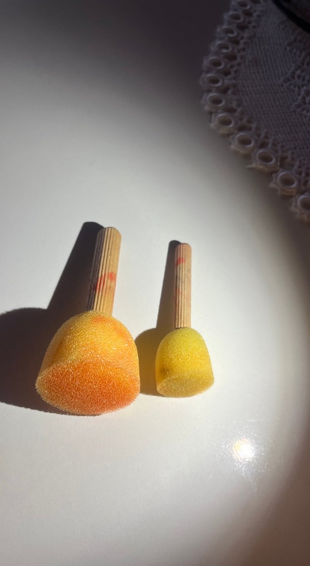 Ahşap saplı, sarı renkte iki makyaj süngeri, makyaj uygulaması için uygundur.
