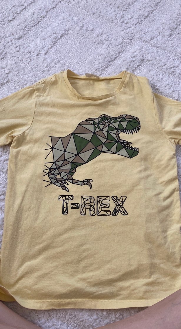 Sarı renkli, gevşek kesim erkek tişörtü kısa kollu ve yuvarlak yakalıdır. Önünde geometrik T-Rex baskısı bulunmaktadır.