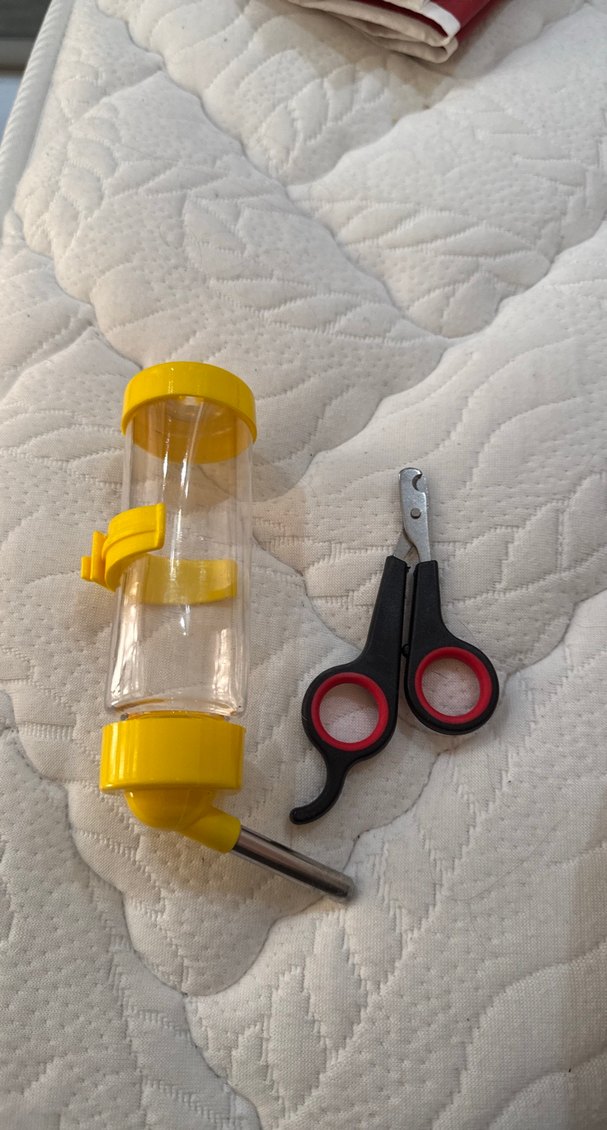 Sarı renkli kedi suluk ve siyah-kırmızı tırnak makası seti, evcil hayvan bakımı için uygundur.