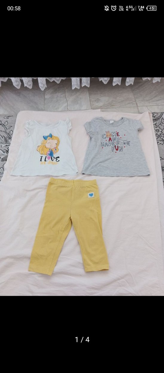 Bebek kız için iki kısa kollu baskılı üst ve sarı tayttan oluşan rahat ve şık takım. 4 5 yaş takım hepsinin fiyatıdır. Sarı kapri ve gri t-shirtte belli belirsiz leke vardır. Kullanıma engel değildir. Alıcısı şimdiden güle güle kullansın.
