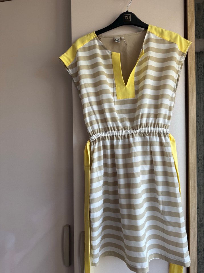 Sarı ve ten çizgili bu kolsuz midi elbise, V yakalı ve kemerli, rahat kesimiyle günlük kullanıma uygundur.