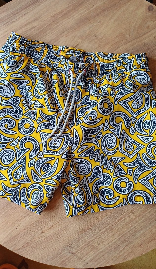 Sarı renkli, bağlama desenli, bol kesim ve lastikli bel detaylı erkek mini mayo, plajda bohem tarzı için uygun.