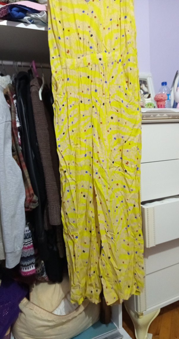 Sarı tie-dye desenli, pilili ve salaş kesim uzun kadın pantolonu, yumuşak sentetik kumaştan yapılmıştır, bohem tarzı yansıtır.