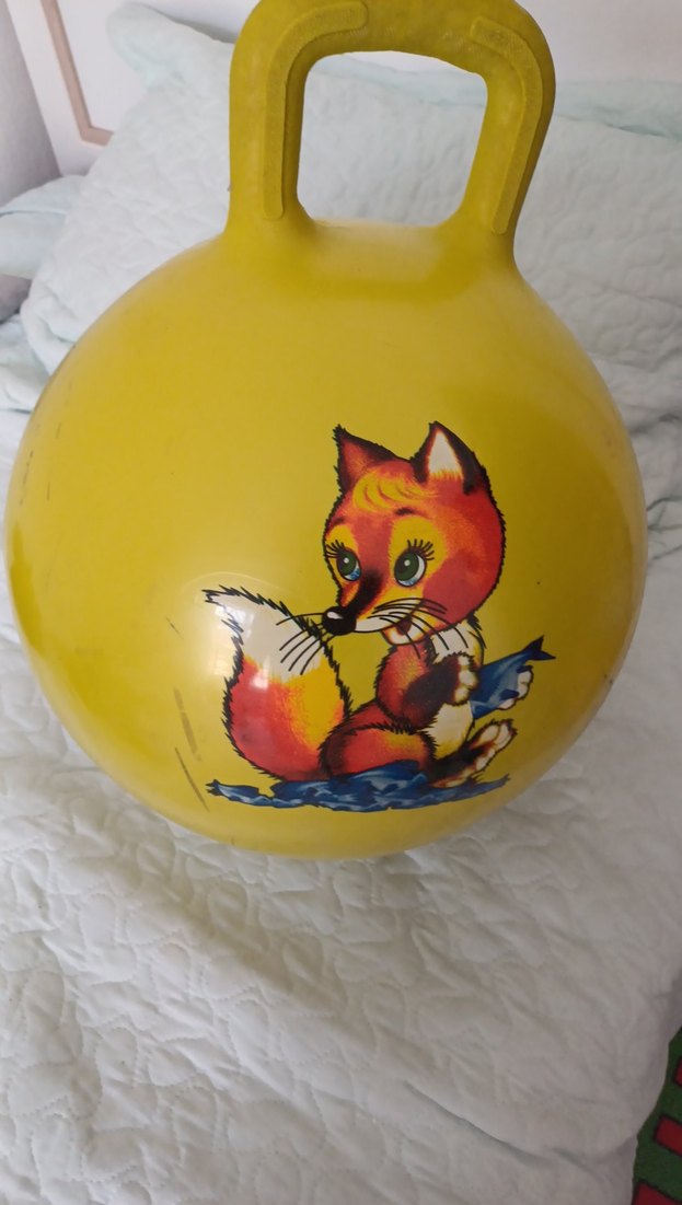 Renkli sarı zıplayan top, üzerinde sevimli bir tilki resmi bulunur.