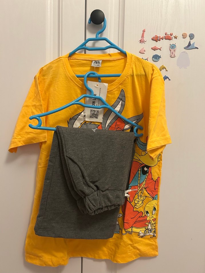 Canlı sarı renkli, kısa kollu tişört ve elastik bel detaylı gri çocuk pantolonundan oluşan takım. Rahat ve günlük kullanım için uygun. Yeni etiketli hiç kullanılmadı defosu yoktur ütü pakette kalan ürünümüzdür