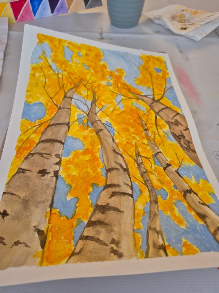Mavi gökyüzü fonunda sarı yapraklı uzun ağaçların yer aldığı canlı sonbahar manzarası tablosu. A4 boyut Çerçevesi gönderilecektir kendi ürünüm