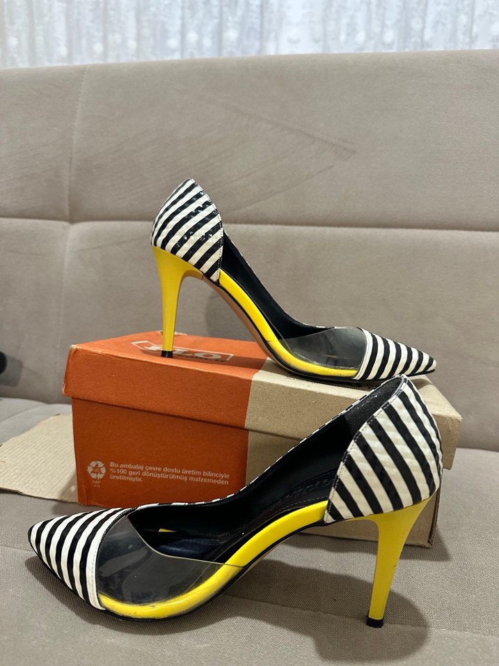 Sarı topuklu, zebra desenli, pile detaylı kauçuk stiletto. Cesur ve çağdaş tasarım, ofis kullanımı için uygundur.