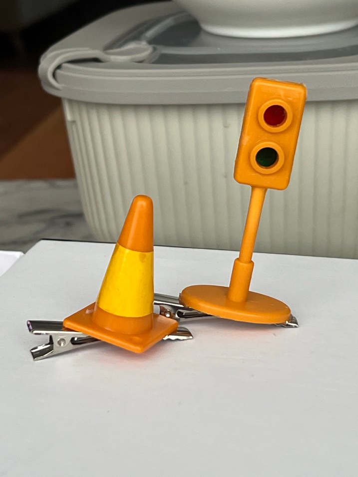 Renkli plastikten yapılmış, tokalı saç tokaları. Trafik konisi ve ışık figürlü, baskılı detaylara sahip.