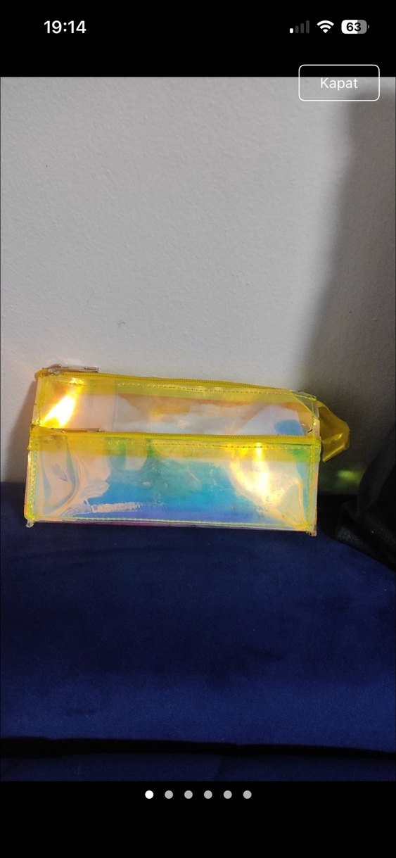 Sarı kenarları ve renkli tie-dye desenli, şeffaf plastikten yapılmış makyaj çantasıdır. Minimalist ve avant-garde tarzları tercih edenler için uygundur. boyu 20 santim alt genişliği 11 santim genişlik 8 santim aynalı model 4 gözlü