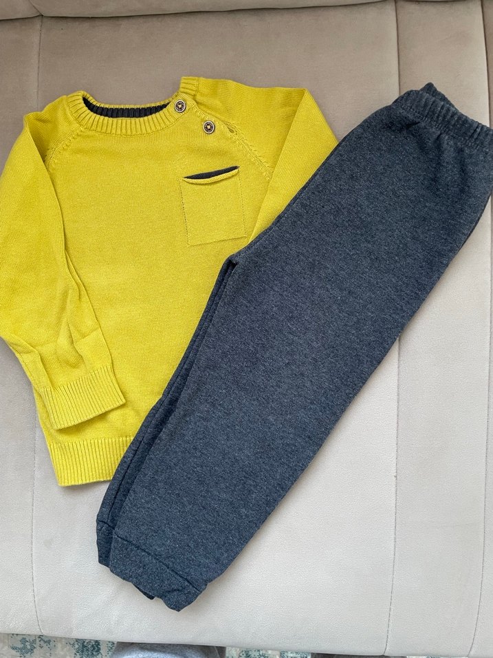Sarı triko uzun kollu bisiklet yaka üst ve gri triko pantolondan oluşan bebek takımı. Desensiz, normcore tarzda rahat bir set.