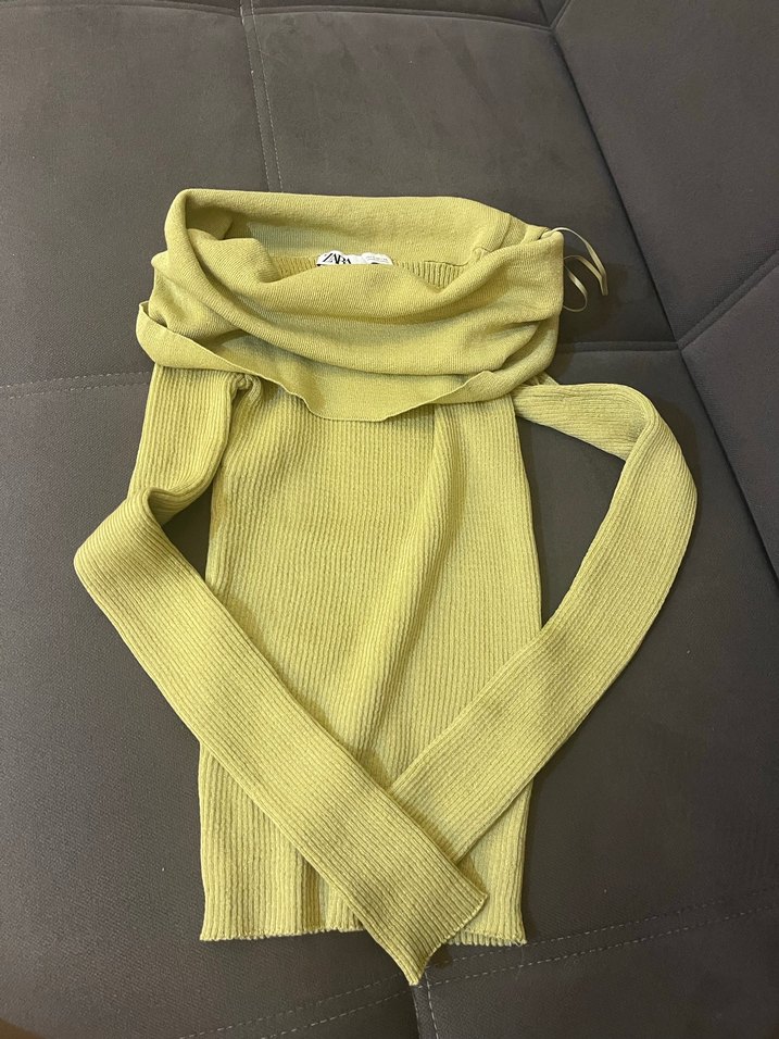 Bu açık yeşil triko kazak, boğazlı ve ince askılı tasarımıyla trend bir günlük stil sunar. Pastel tonları ve normal boyu günlük kullanıma uygundur. 1 defa çok az kullanılmıştır hiç bir defosu yoktur