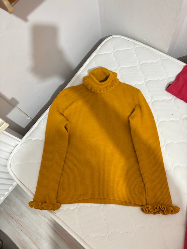 Fitted kesim, boğazlı ve uzun kollu, fırfırlı uçlu sarı triko kazak, günlük kullanıma uygun parlak ve rahat bir görünüm sunar. Giyilmedi temiz düzgün defo yok M bedenlilerede olur
