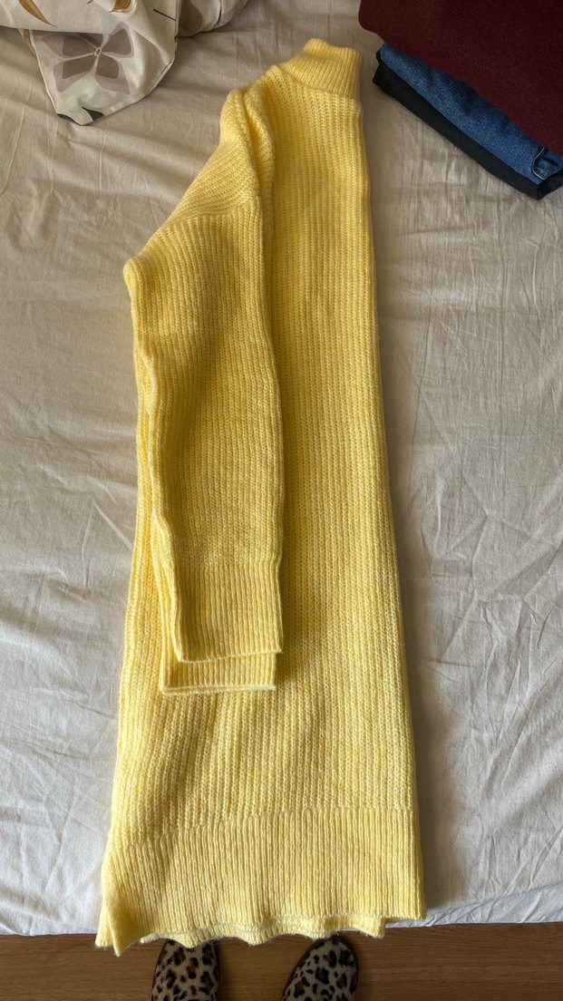 Fitted kesim, uzun kollu, boğazlı sarı triko kazak. Midi boyda, pastel renkte ve örme dokuda, günlük kullanıma uygun.