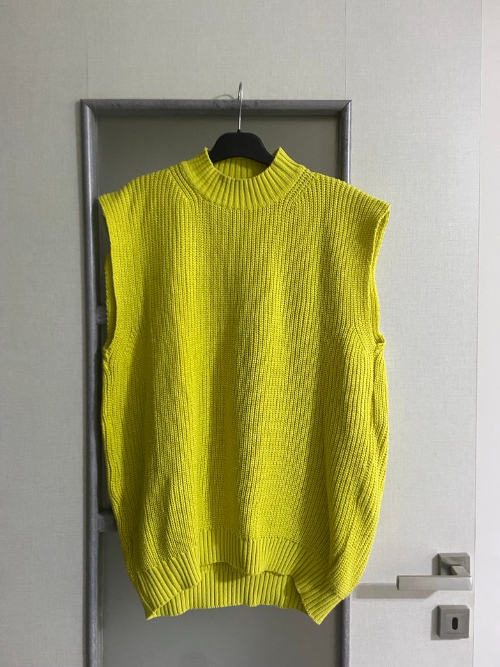 Sarı renkte, boğazlı ve kolsuz örme kadın süveter. Rahat ve bol kesimiyle günlük kullanıma uygun, midi uzunlukta sade bir tasarım.