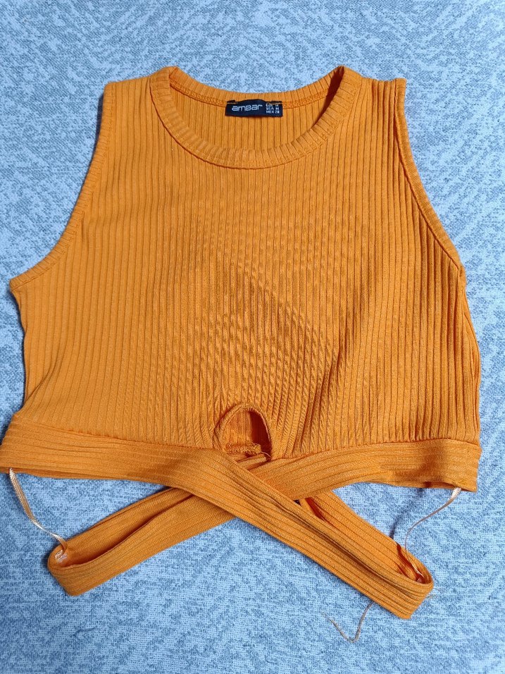 Sarı renkli, triko kumaştan yapılmış, halter yaka ve kolsuz, belden bağlamalı crop top. Rahat ve şık dış mekan kullanımı için uygun.