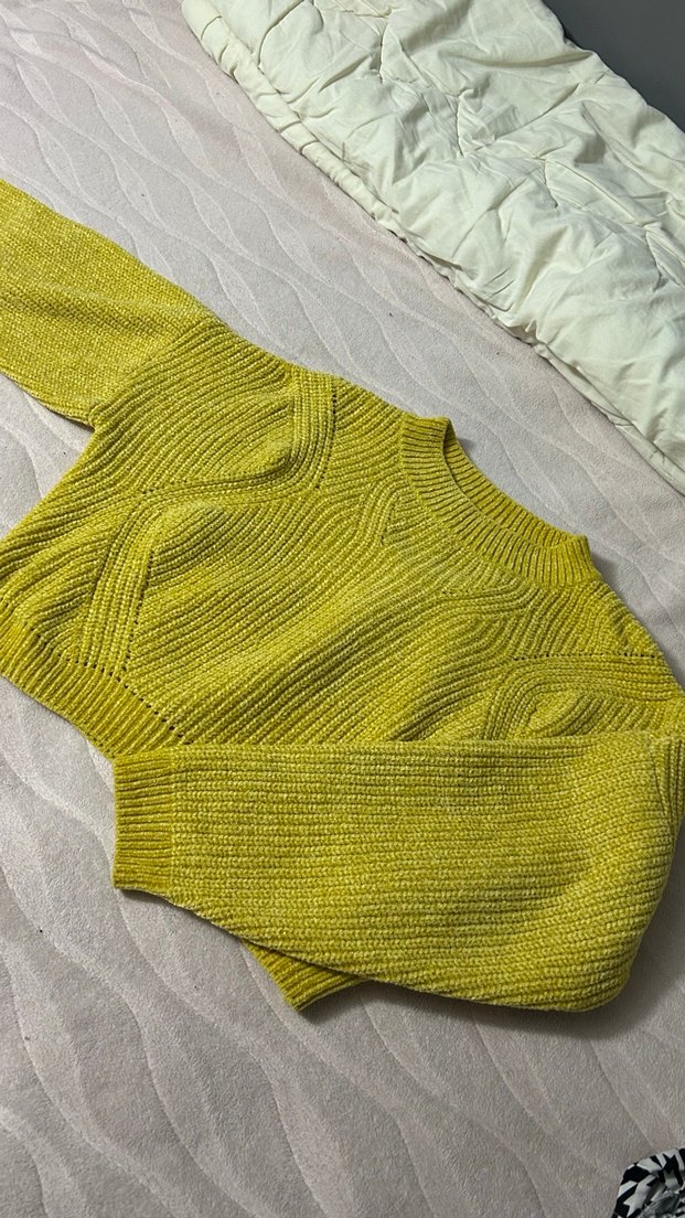 Sarı renkli, bisiklet yaka ve uzun kollu, triko kumaştan örülmüş, vücuda oturan normal uzunlukta kazak. Rahat ve sade tasarım sunar.