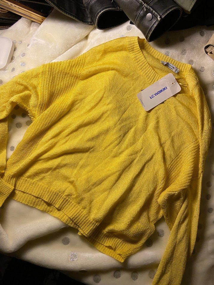 Sarı renkli, uzun kollu ve bisiklet yaka triko kadın kazak, rahat kesimi ve normal boyuyla günlük kullanıma uygundur.