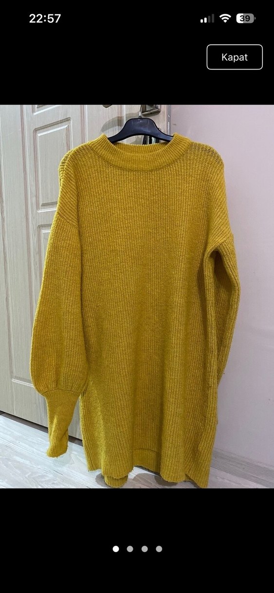 Uzun kollu, yuvarlak yaka, bol kesim sarı örgü kadın kazak, rahat ve gündelik tarz için uygundur. Standart beden