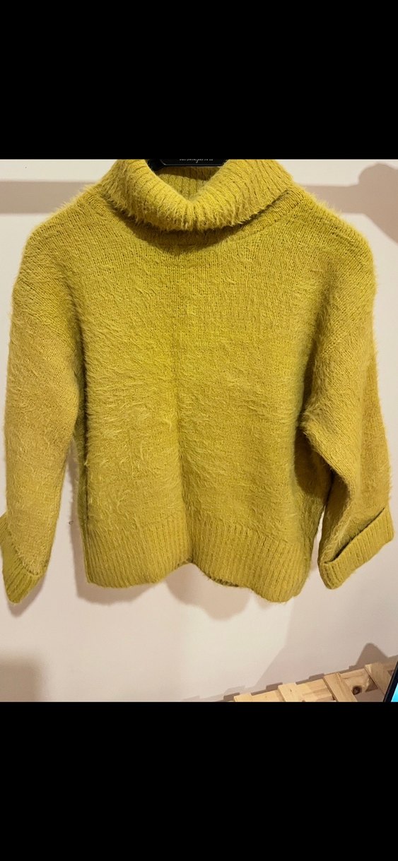 Sarı renkli, triko dokulu, boğazlı ve uzun kollu kadın kazak. Salaş kesimi ve desen içermeyen sade tasarımıyla günlük kullanıma uygundur.