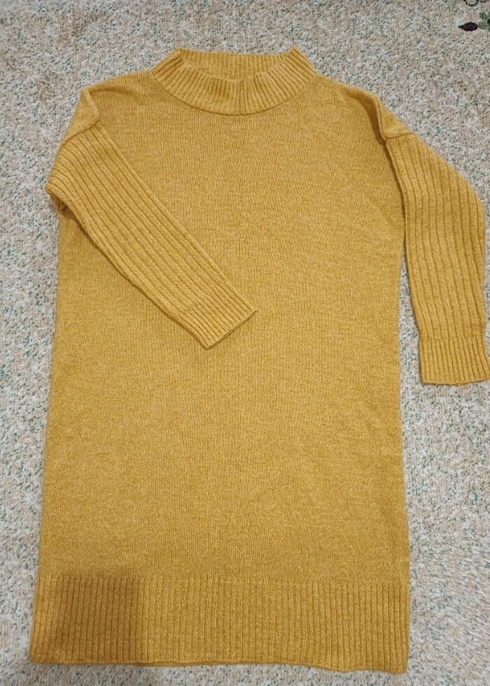 Sarı triko tunik, uzunluk 90 cm, standart beden Ben 55 kilo ve 163 boyundayim bana rahatlıkla geniş bir şekilde oluyor