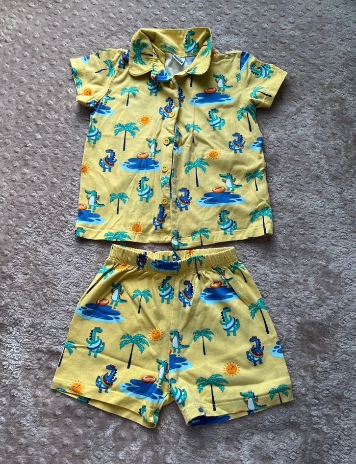 Kısa kollu, yakalı ve düğmeli sarı tropikal desenli bebek pijama takımı. Yumuşak pamuklu kumaştan severek giydirdim :)