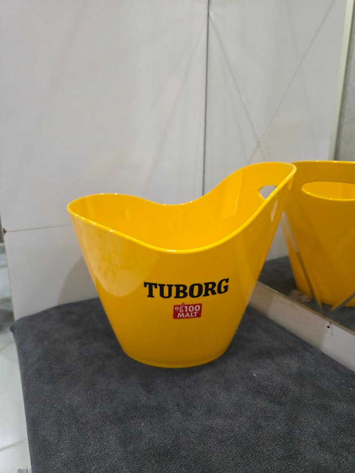 Sarı renkli Tuborg yazılı, . Kolay tutulabilen kulplara sahip.
