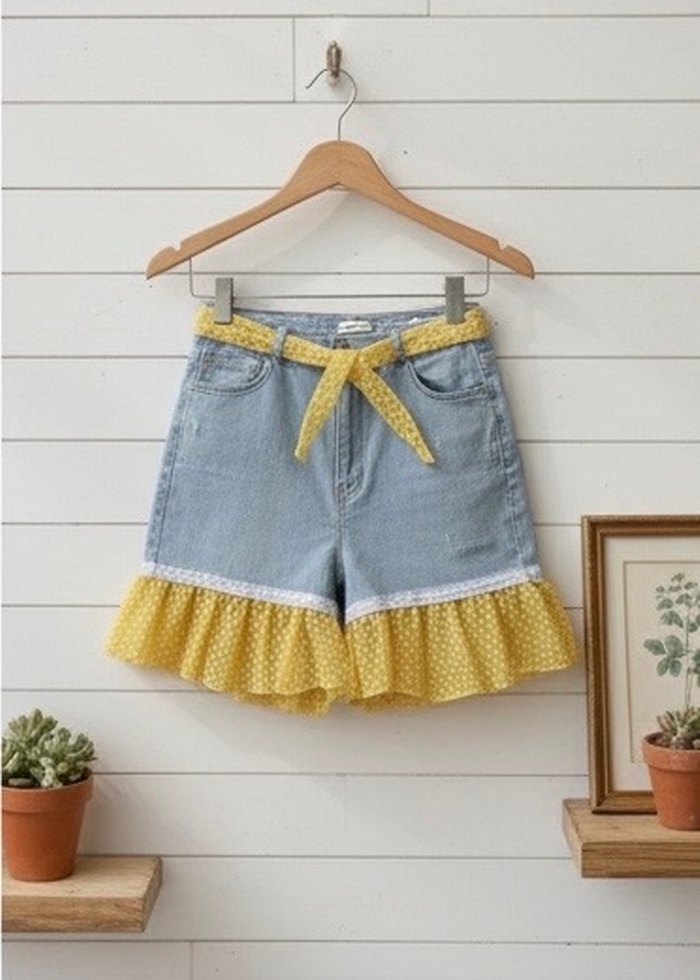 Açık mavi kot şort, bol kesim ve alt kısmında sarı tül detayları ile beraber sarı dantel kemer içerir.