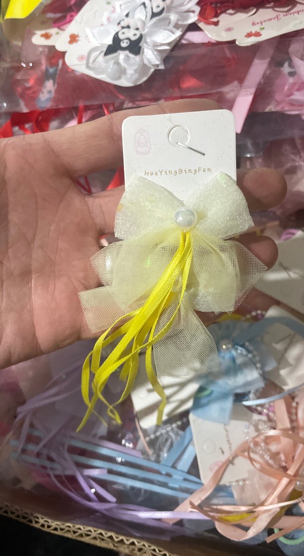 Yumuşak, şeffaf kumaştan yapılmış fiyonk şeklinde, sarı tüllü saç tokası. İnci detayı ve desenli, HuaYingBingFe markalı.