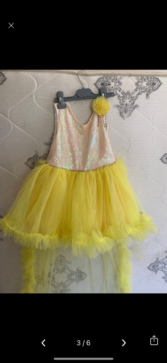 Kolsuz, straplez payetli üst ve bol, fırfırlı tül etekli sarı kız çocuk elbisesi, şık bir görünüm sunar.