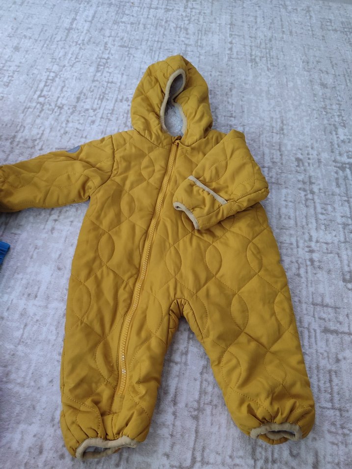 Sarı renkli bebek kayak tulumu, fermuarlı ve kapüşonludur. Yumuşak, sıcak tutan polar kumaştan üretilmiştir ve düz desene sahiptir.