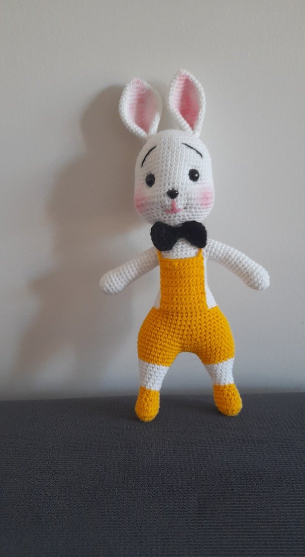 Siyah papyonlu, sarı örgü tulum giymiş renkli peluş tavşan oyuncak. Yumuşak ve detaylı el işi.