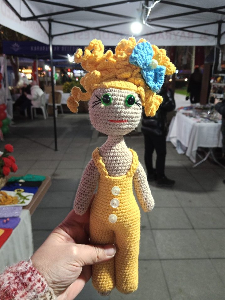 Sarı tulumlu, kıvırcık saçlı ve mavi fiyonk detaylı renkli el örgüsü bebek. Önde düğme süslemeleri bulunur.