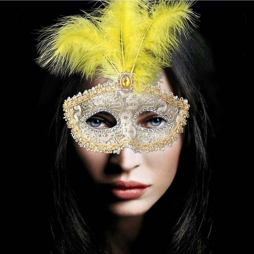 Sarı Tüylü Taş Süslemeli Parti Maskesi