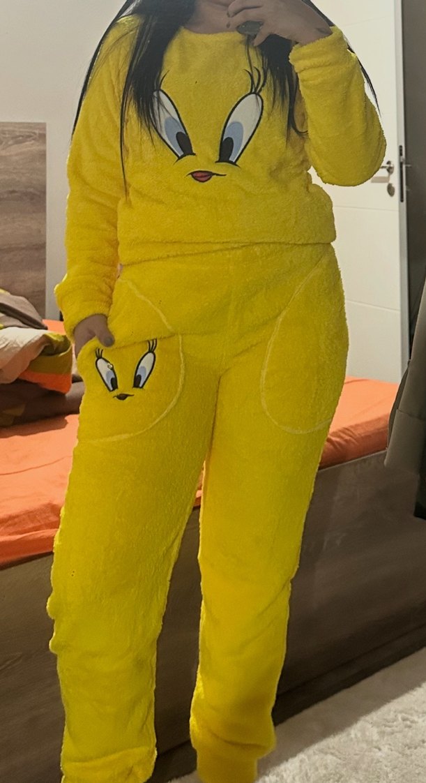 Pofuduk sarı kumaştan, Tweety baskılı, uzun kollu ve bisiklet yaka kadın pijama takımı. Fit kesimiyle trend ev stilini yansıtıyor.