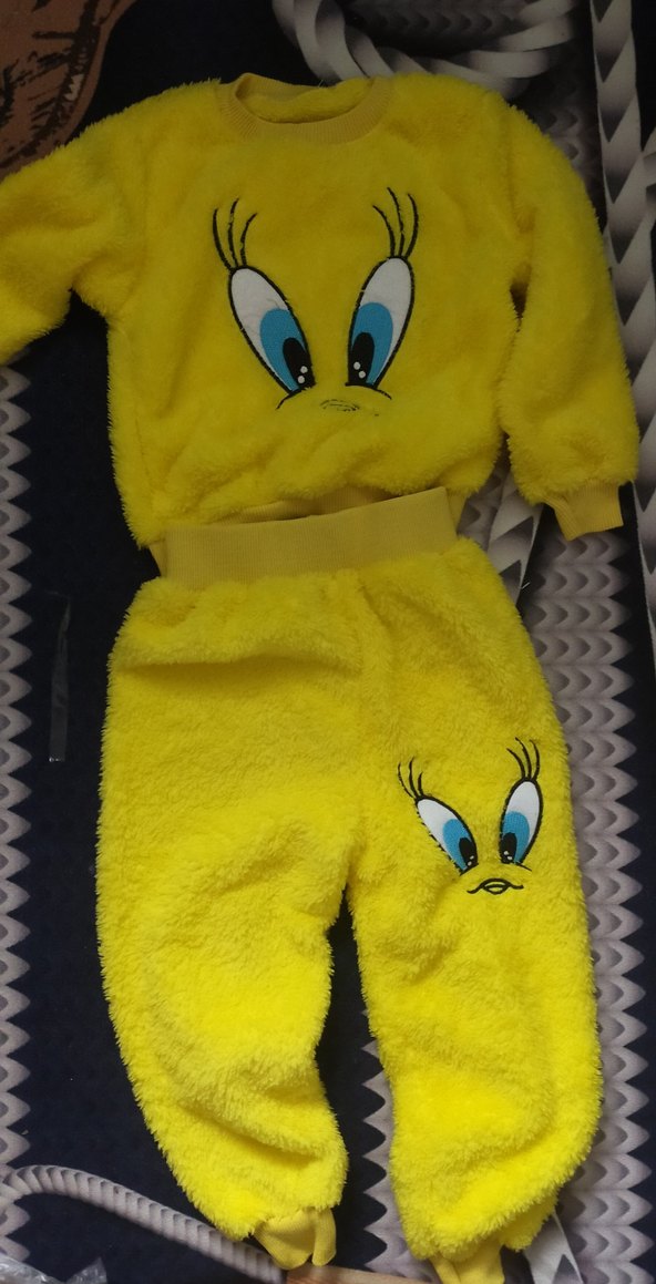 Yumuşak ve sıcak sarı kumaştan, uzun kollu, bisiklet yaka ve kabarık tasarımlı, Tweety nakışlı fitted kız eşofman takımı. Trendy rahat stil için uygun. 4-5 yaş