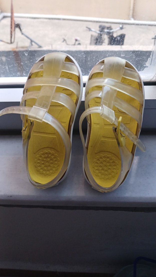 Bu açık sarı kauçuk unisex çocuk terlikleri, tokalı kayışıyla sağlam bir tutuş sağlar. Desensiz ve modaya uygun avant-garde tarzda tasarlanmıştır. çok az giyildi kusursuz ve rahat