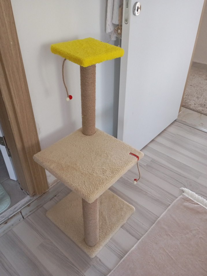 Bej tabanlı, iki kolonlu ve renkli sarı üst platformlu kedi tırmalama tahtası. Oyun için asılı toplar içerir.