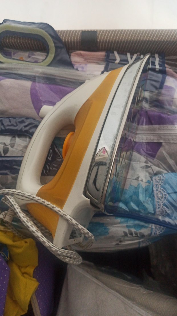 Hafif sarı renkte, sağlam saplı ve pürüzsüz ütüleme için metal tabanlı ütü. Dayanıklı kumaş kaplı kablo içerir.