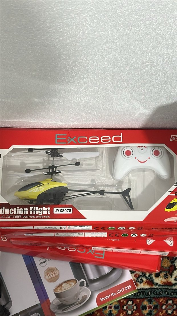 Canlı sarı renkte, çift modlu uçuş özellikli uzaktan kumandalı helikopter ve beyaz kumanda içerir.