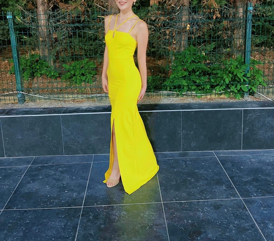 sarı, yırtmaçlı, vücuda oturan abiye 1-2 kere giydim. Milla marka 34 beden. Boyum 165 kilom 54 yaklaşık 10 cm topuklu ile ekledim görselleri