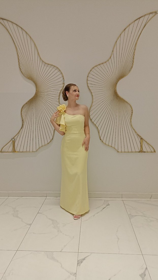 Straplez, drapeli ve tek omuz askılı, sarı renk uzun abiye elbise. Modern klasik tarzda, düğün ve özel davetlere uygun şık model. M bedendir