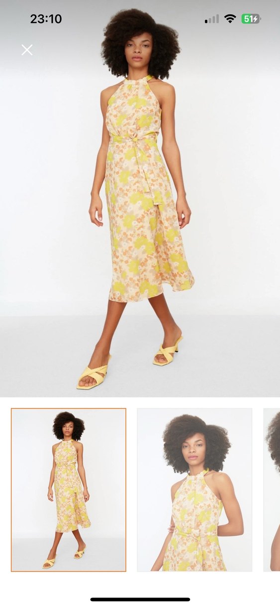 Sarı uzun elbise, askılı ve straplez yakaya sahip. İpek gibi kumaştan, drapeli ve hafif batik desenli. Ürün hiç giyilmemiştir deforme yoktur ürün temizdir. Pazarlık yapılır.