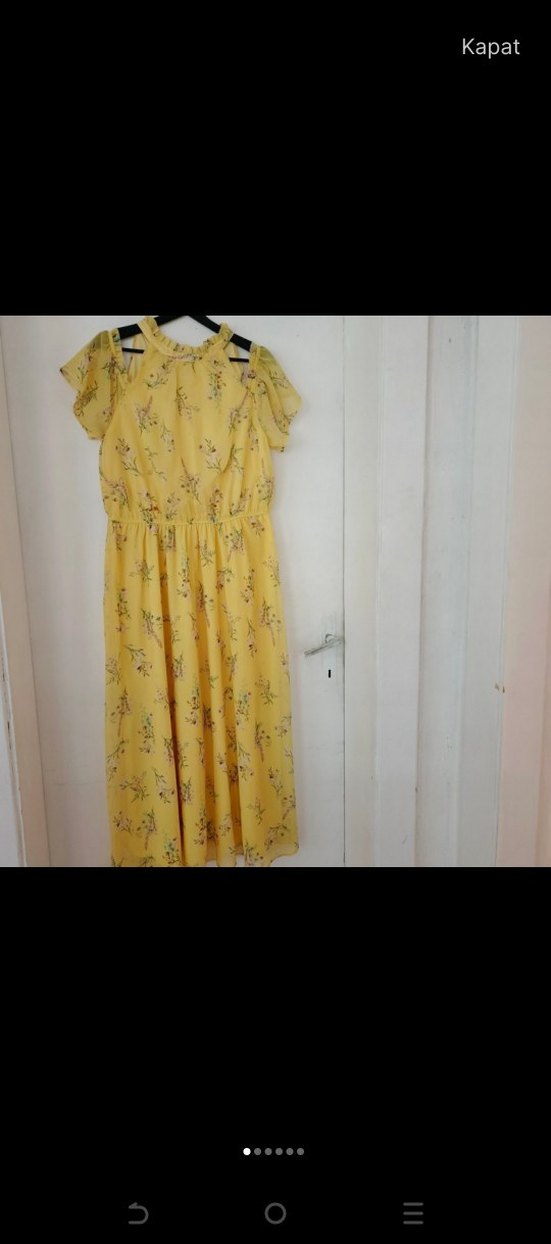 Sarı uzun elbise, bol kesim, kısa fırfırlı kollar ve tekne yaka ile. Hafif çiçek desenli, sentetik kumaştan, günlük kullanım için uygun.