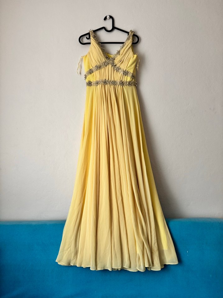 Sarı uzun abiye elbise, drapeli tasarımı ve ince askılı V yaka ile vintage bohem tarzı sunar. Düğünler için uygun, parlak görünümlü ve vücuda oturan kesim.