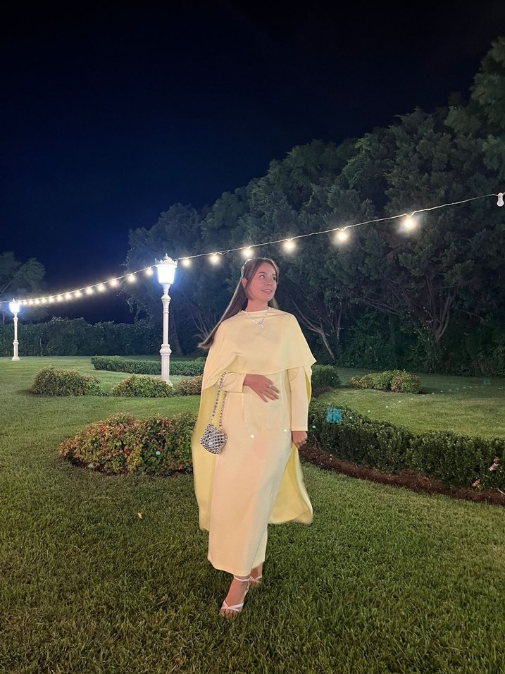 Sarı uzun elbise, drapeli tasarımı ve uzun kollu bol kesimiyle dikkat çekiyor. Sentetik kumaştan, straplez yakalı ve desensiz, düğün için uygun.