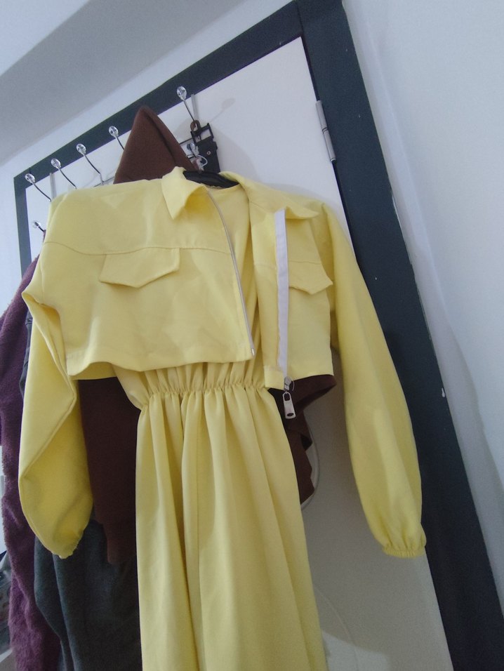 Sarı uzun, bol kesim hamile ceketi, yakalı ve askılı kollu, dökümlü tasarıma sahip sentetik kumaştan üretilmiştir. Minimalist pastel görünümüyle günlük sokak modasına uygundur.